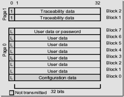 頁0有8個塊,每個塊有33位,第一位為鎖定位,當第一位寫入為1,該塊后面的32位就無法修改了。頁0塊0為配置字,決定了卡片跟閱讀器通信時工作的頻率,調制方式及卡片頁0塊號可見數目等。配置字很關鍵,同樣的T5557卡片,有些閱讀器能讀,有些閱讀器不能讀的,這個閱讀器內部單片機的具體程序設計相關,所以一旦設置好不要輕易修改。