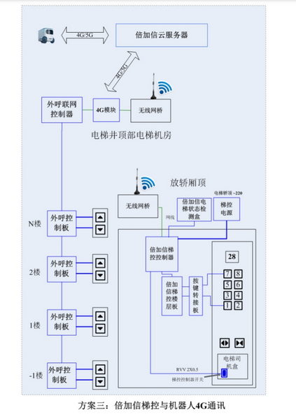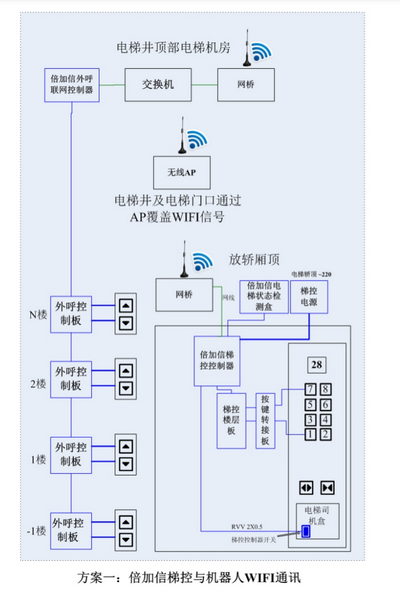 機(jī)器人通過無線信號(hào)的傳輸,將乘梯指令直接下達(dá)到電梯控制系統(tǒng),電梯狀態(tài)監(jiān)測(cè)實(shí)時(shí)識(shí)別樓層,實(shí)現(xiàn)機(jī)器人自主乘梯,直達(dá)目的樓層。該方案解決了機(jī)器人改變了以往只能在平層移動(dòng)的限制,大大拓展機(jī)器人的應(yīng)用范圍和領(lǐng)域。