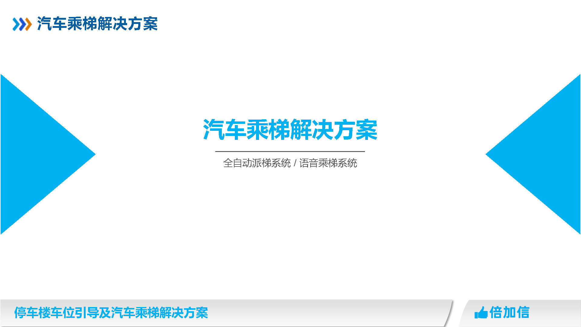 倍加信汽車乘梯系統方案優勢 1、通過視頻/超聲波/地磁,實時獲取停車樓各樓層空余車位數/ 2、入庫電梯屏、電梯橋箱屏、分區引導屏實時引導車主停車 3、車牌識別自動呼叫電梯到達當前樓層,包括入場乘梯和離場乘梯 4、不需要電梯提供協議,汽車派梯系統可自動根據各樓層空余車位數,自動派梯 5、不需要電梯提供協議,可實時獲取電梯當前停靠樓層、電梯上下行狀態、開關門狀態 6、不需要電梯提供協議,可語音識別招梯和乘梯,包括客梯也可以語音乘梯 7、不需要電梯提供協議,可實現汽車電梯禁止人員乘梯,包括內呼和外呼都禁止 8、可自動派梯和語音乘梯組合使用,特別是離場樓層有多層情況車主可自己選擇樓層 9、汽車乘梯過程可禁止其他汽車招梯,防止電梯未到達指定樓層就停靠 10、可在電梯門口增加紅綠指示燈,顯示當前汽車電梯是可用或正在使用狀態 11、電梯提供協議,也可以與電梯協議對接實現上面所有功能
