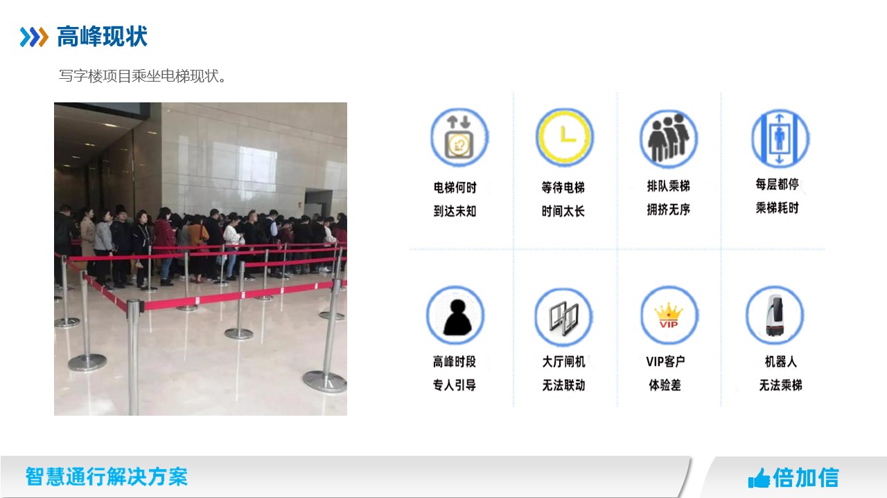 在寫字樓場(chǎng)所,早晨上班高峰期、午高峰、下午下班晚高峰,經(jīng)常出現(xiàn)出現(xiàn)排長(zhǎng)隊(duì)擁堵情況,高峰期電梯運(yùn)力不足成為所有寫字樓物業(yè)管理的痛點(diǎn)。