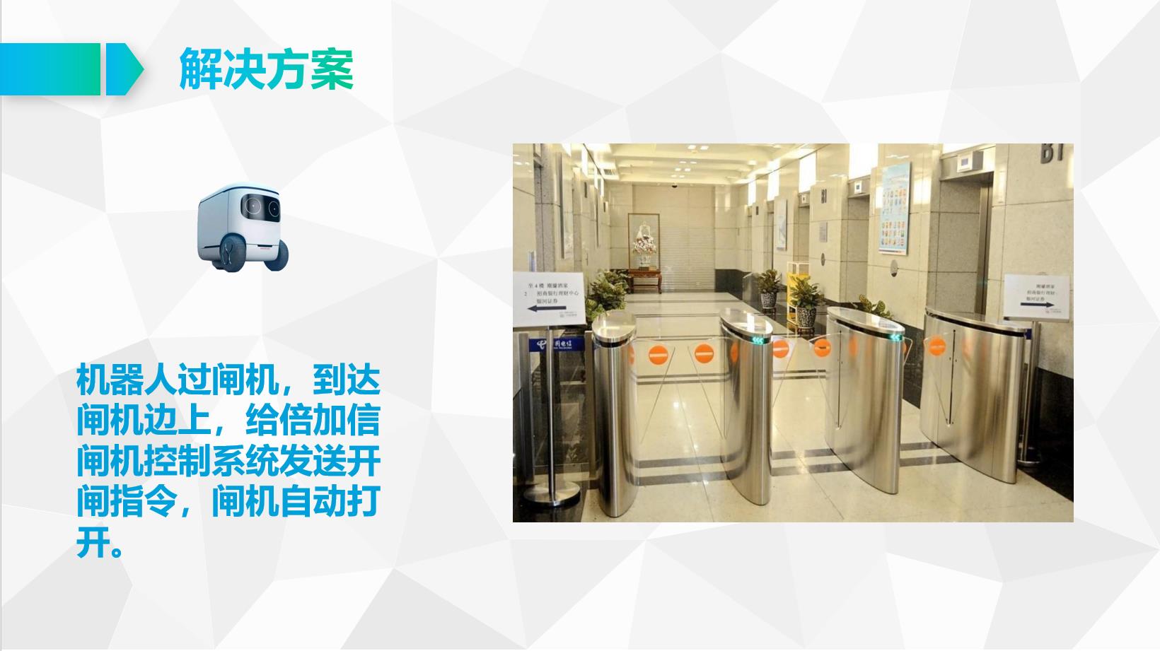 機器人過閘機,到達閘機邊上,給倍加信閘機控制系統發送開閘指令,閘機自動打開。