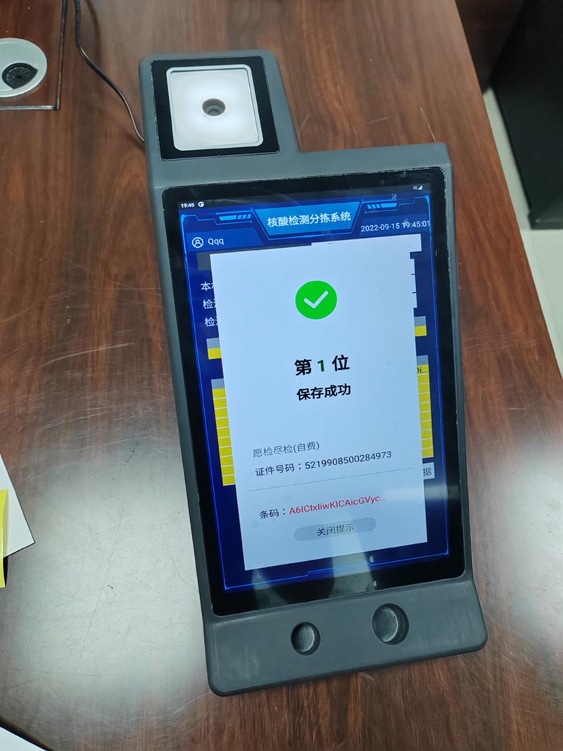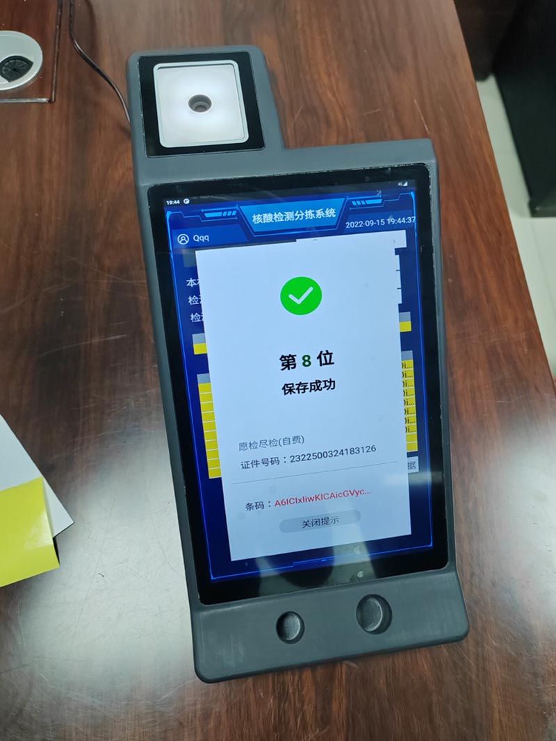 2.、做核酸人員掃核酸碼,系統提示采集成功,同時工作人員拿棉簽