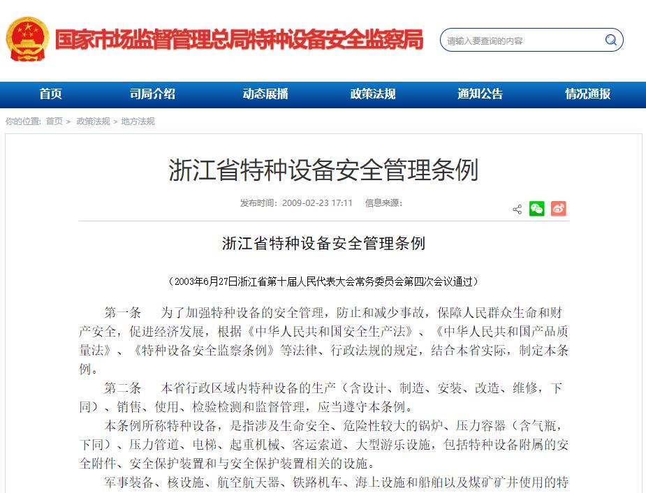 《浙江省特種設備安全管理條例》2003年6月27日浙江省第十屆人民代表大會常務委員會第四次會議通過